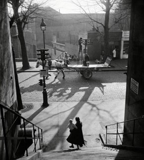 J’en rajouterai une 3ème de mon ami Willy Ronis, disparu en 2009, l’escalier de la rue Simon Bolivar à Paris en 1950. Une image riche où tout est en place. La femme et son enfant, le cheval et la charrette, le réparateur de feu tricolore, le cordonnier en blouse blanche et le petit chat noir en bas à gauche.